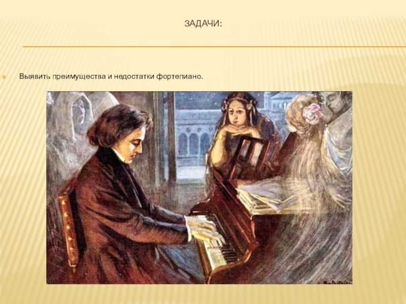 У фортепиано огромные безграничные возможности, поэтому многие великие музыканты предпочли этот инструмент, создавая для него произведения искусства, настоящие шедевры. Такие великие музыканты как: Л. Бетховен, Ф. Шопен, Ф. Шуберт, В. Моцарт, С. Рахманинов, П. Чайковский, А. Скрябин и многие другие. Они выступали и как пианисты, показывая неограниченные возможности инструмента. И сегодня среди нас живёт этот инструмент – фортепиано. И чаще других он помогает нам ощущать великую силу музыки и радость общения с ней.