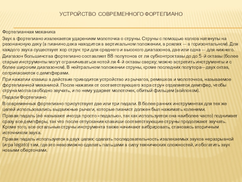 Постепенно мастера совершенствовали инструмент. Сейчас фортепиано имеет достаточно сложное устройство. Весь механизм его состоит из струн и молоточков, рычагов и ремней, педалей и клавиш. И только в совокупности все эти приспособления заставляют инструмент звучать. Сегодня крупные производители фортепиано имеют свои, немного различающиеся, версии фортепианной механики.