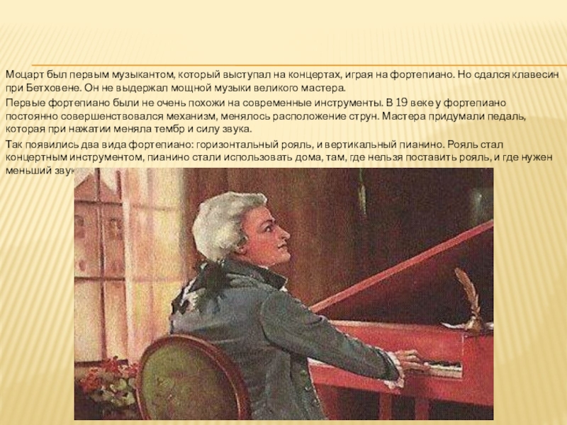 Слайд 20Моцарт был первым музыкантом, который выступал на концертах, играя на фортепиано.