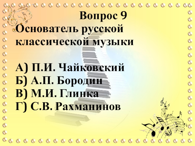 Вопрос 9 Основатель русской классической музыки А) П.И. Чайковский Б) А.П. Бородин В) М.И. Глинка Г) С.В. Рахманинов
