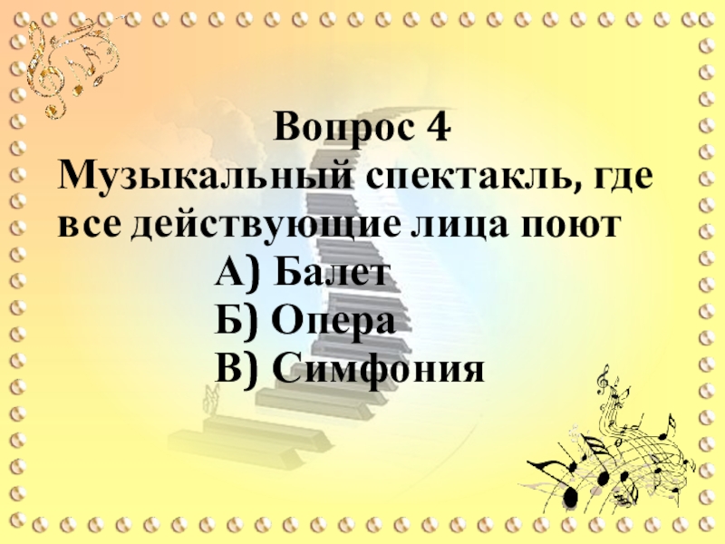 Вопрос 4 Музыкальный спектакль, где все действующие лица поют А) Балет Б) Опера В) Симфония