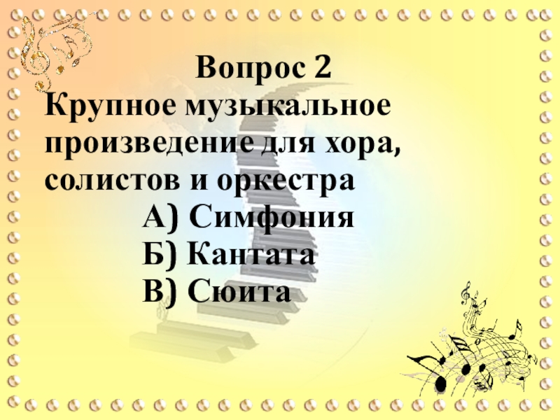 2 Крупное музыкальное произведение для хора, солистов и оркестра А) Симфония Б) Кантата В) Сюита