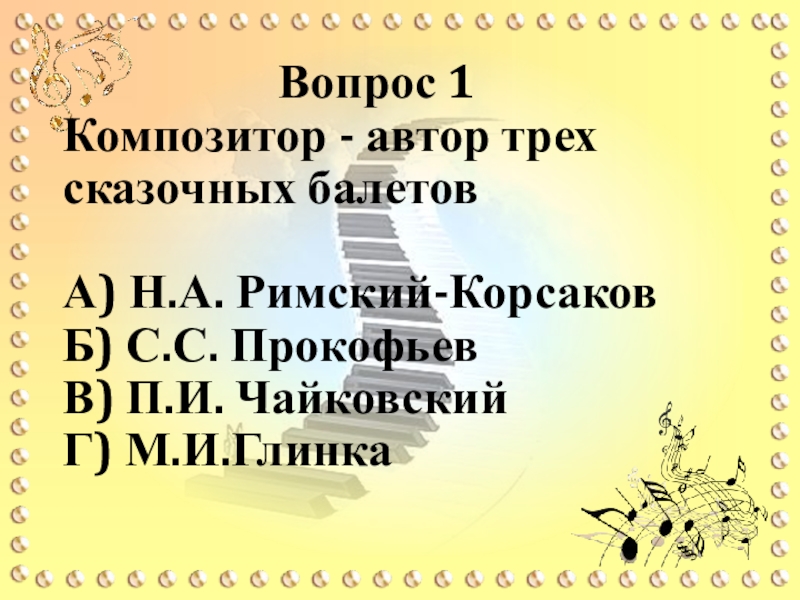 Вопрос 1 Композитор - автор трех сказочных балетов А) Н.А. Римский-Корсаков Б) С.С. Прокофьев В) П.И. Чайковский Г) М.И.Глинка