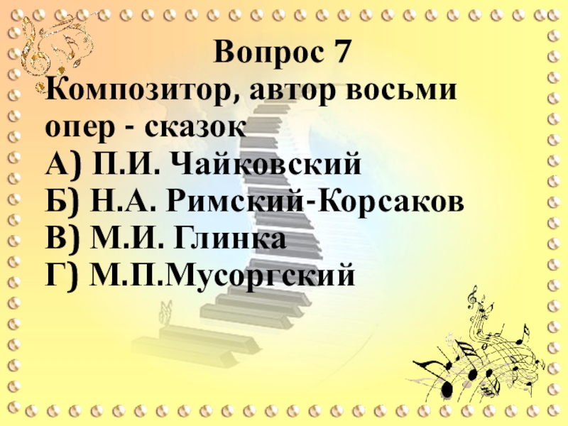 Вопрос 7 Композитор, автор восьми опер - сказок А) П.И. Чайковский Б) Н.А. Римский-Корсаков В) М.И. Глинка Г) М.П.Мусоргский
