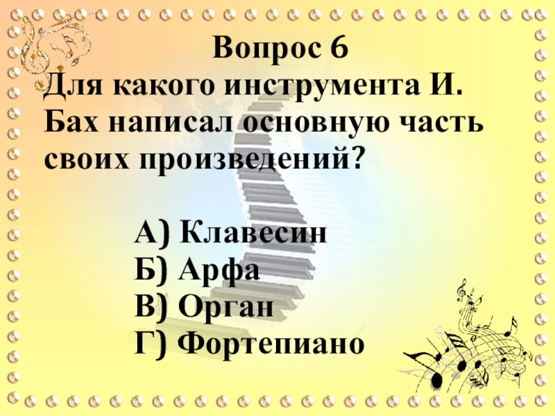 Вопрос 6 Для какого инструмента И.Бах написал основную часть своих произведений? А) Клавесин Б) Арфа В) Орган Г) Фортепиано