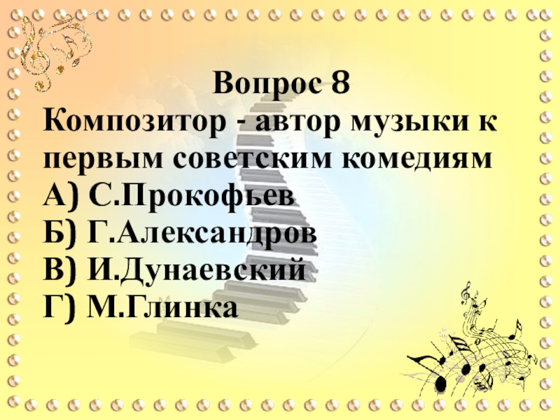 Вопрос 8 Композитор - автор музыки к первым советским комедиям А) С.Прокофьев Б) Г.Александров В) И.Дунаевский Г) М.Глинка