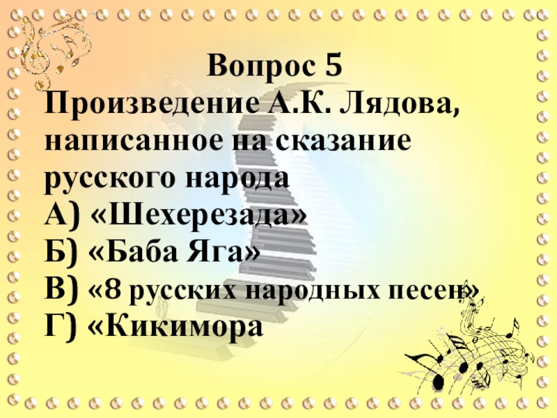 Вопрос 5 Произведение А.К. Лядова, написанное на сказание русского народа А) «Шехерезада» Б) «Баба Яга» В) «8 русских народных песен» Г) «Кикимора