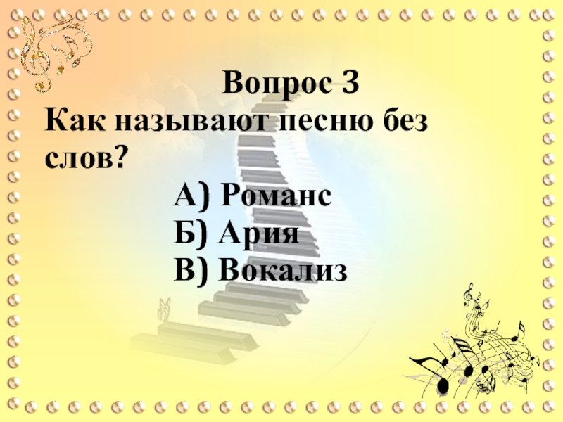 Вопрос 3 Как называют песню без слов? А) Романс Б) Ария В) Вокализ
