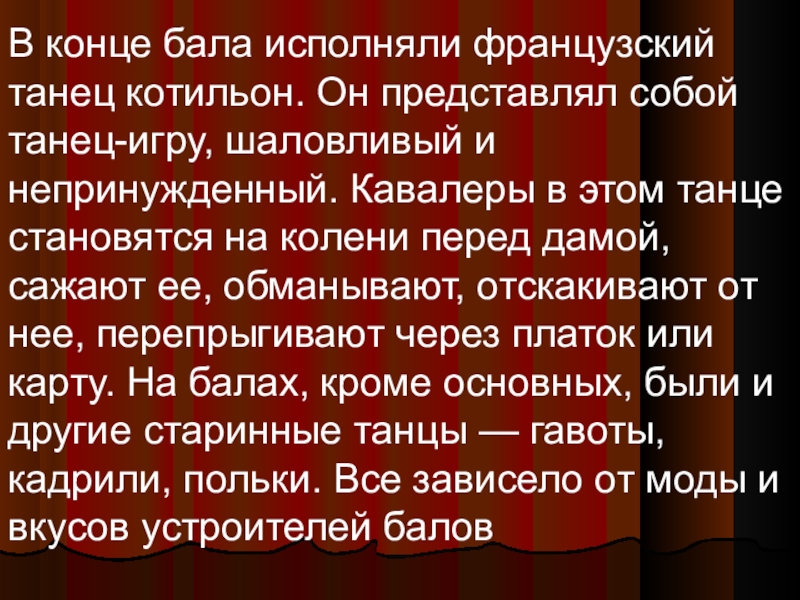 Слайд 13В конце бала исполняли французский танец котильон. Он представлял собой танец-игру,