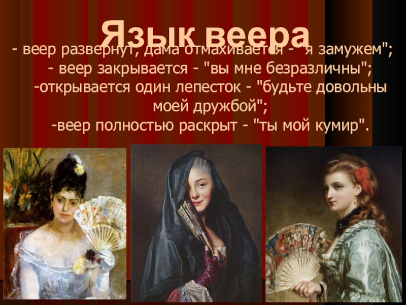 Слайд 9- веер развернут, дама отмахивается - "я замужем";