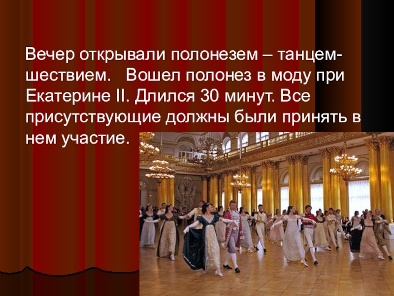 Слайд 10Вечер открывали полонезем – танцем-шествием. Вошел полонез в моду при