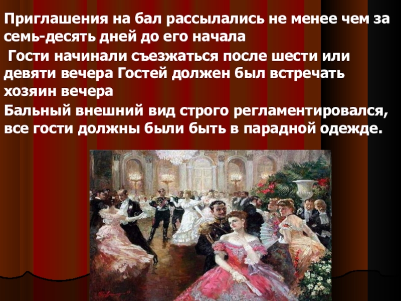 Слайд 7Приглашения на бал рассылались не менее чем за семь-десять дней до