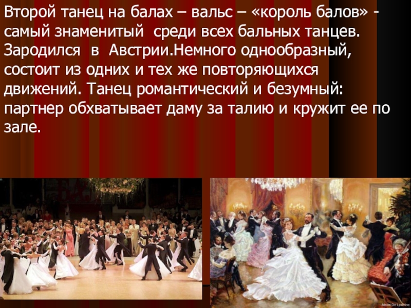 Слайд 11Второй танец на балах – вальс – «король балов» - самый