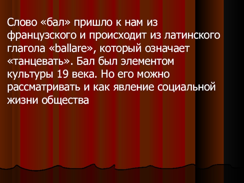 глагола «ballare», который означает «танцевать». Бал был элементом культуры 19 века. Но его можно рассматривать и как явление социальной жизни общества