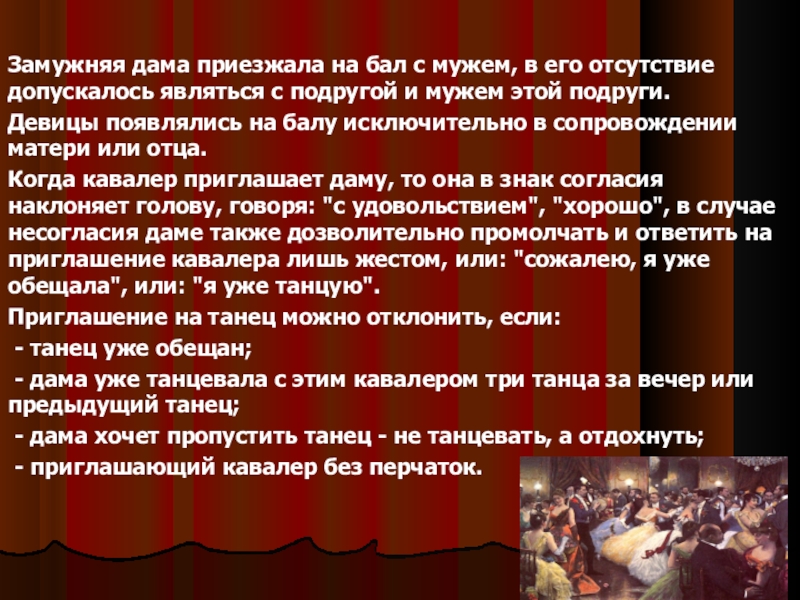 Слайд 8Замужняя дама приезжала на бал с мужем, в его отсутствие допускалось
