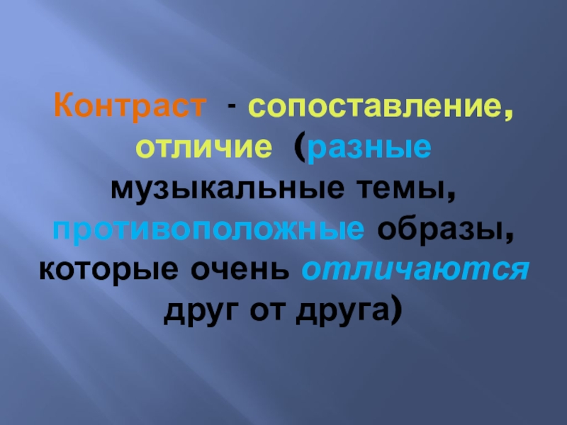 Слайд 10Контраст - сопоставление, отличие (разные музыкальные темы, противоположные образы, которые очень