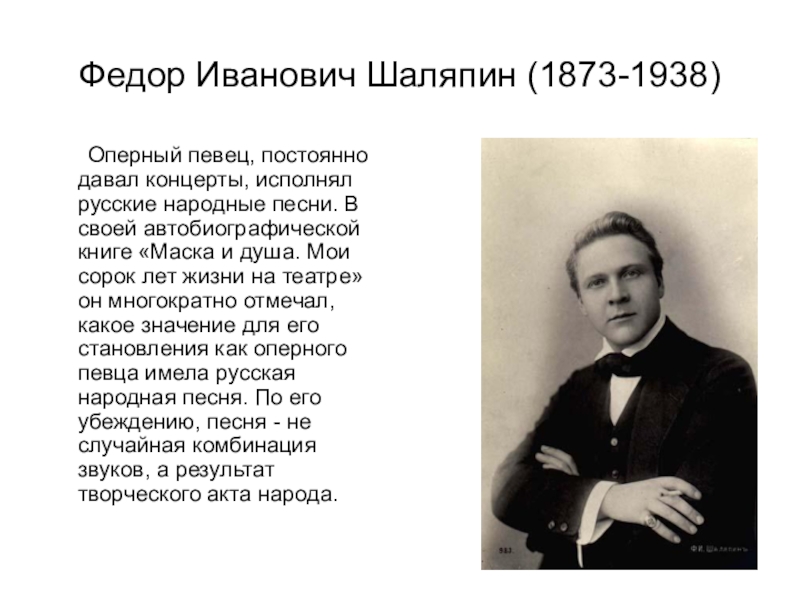 песни. В своей автобиографической книге «Маска и душа. Мои сорок лет жизни на театре» он многократно отмечал, какое значение для его становления как оперного певца имела русская народная песня. По его убеждению, песня - не случайная комбинация звуков, а результат творческого акта народа.
