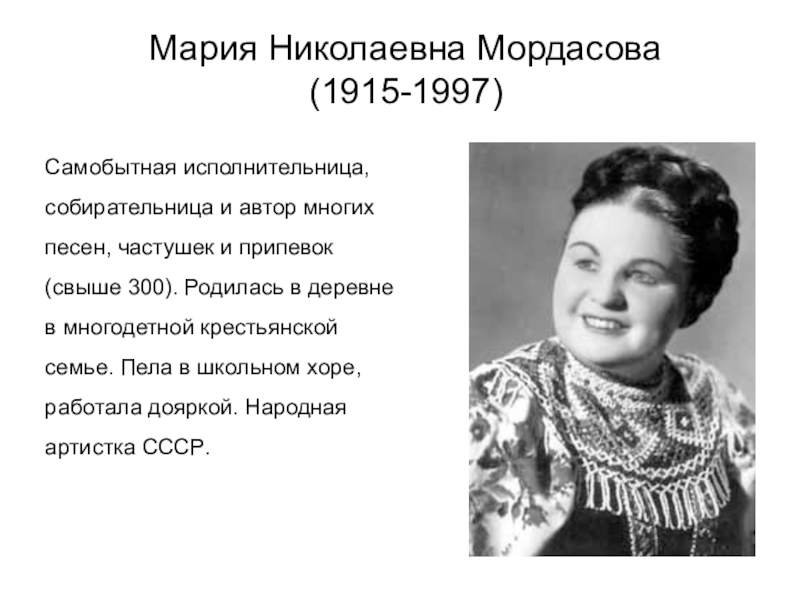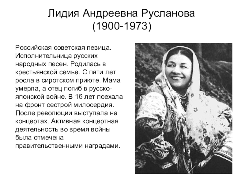 народных песен. Родилась в крестьянской семье. С пяти лет росла в сиротском приюте. Мама умерла, а отец погиб в русско- японской войне. В 16 лет поехала на фронт сестрой милосердия. После революции выступала на концертах. Активная концертная деятельность во время войны была отмечена правительственными наградами.