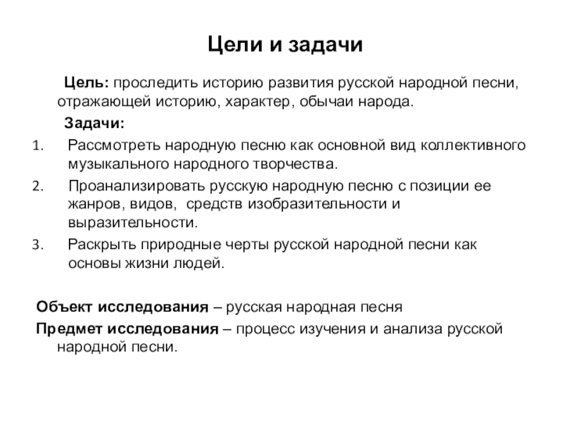 Предмет исследования – процесс изучения и анализа русской народной песни.