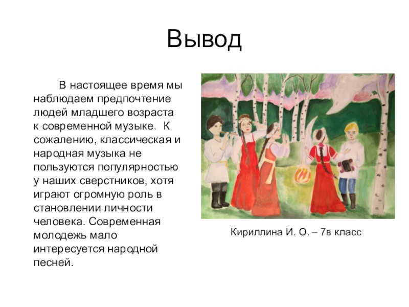 музыке. К сожалению, классическая и народная музыка не пользуются популярностью у наших сверстников, хотя играют огромную роль в становлении личности человека. Современная молодежь мало интересуется народной песней.