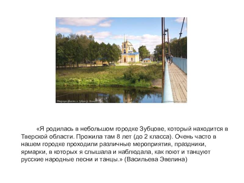 Слайд 13 «Я родилась в небольшом городке Зубцове, который находится в Тверской области.