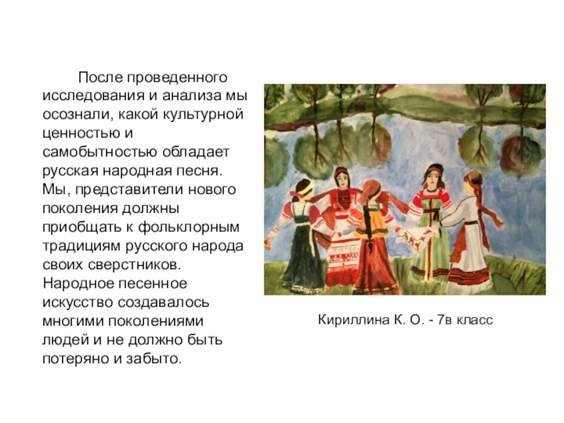 самобытностью обладает русская народная песня. Мы, представители нового поколения должны приобщать к фольклорным традициям русского народа своих сверстников. Народное песенное искусство создавалось многими поколениями людей и не должно быть потеряно и забыто.