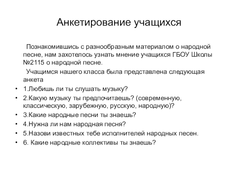 мнение учащихся ГБОУ Школы №2115 о народной песне.