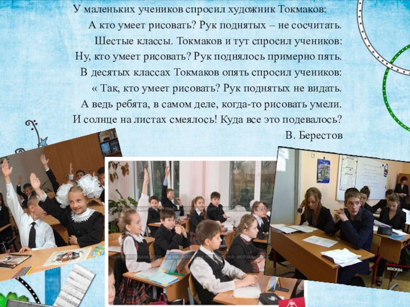 Слайд 3 У маленьких учеников спросил художник Токмаков: