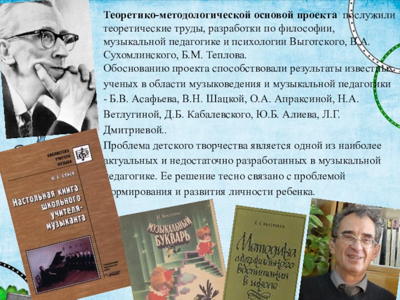Слайд 8Теоретико-методологической основой проекта послужили теоретические труды, разработки по философии, музыкальной педагогике