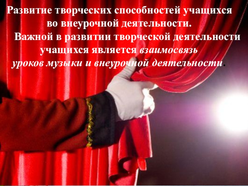 Слайд 7Развитие творческих способностей детей на уроках музыки и во внеурочной деятельности