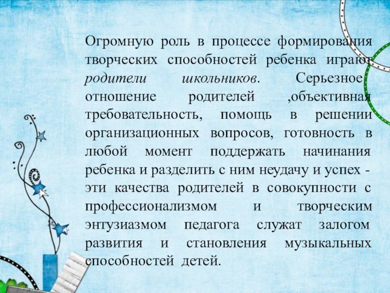 Слайд 23Огромную роль в процессе формирования творческих способностей ребенка играют родители школьников.