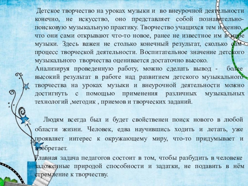 не искусство, оно представляет собой познавательно-поисковую музыкальную практику. Творчество учащихся тем и ценно, что они сами открывают что-то новое, ранее не известное им в мире музыки. Здесь важен не столько конечный результат, сколько сам процесс творческой деятельности. Воспитательное значение детского музыкального творчества оценивается достаточно высоко.