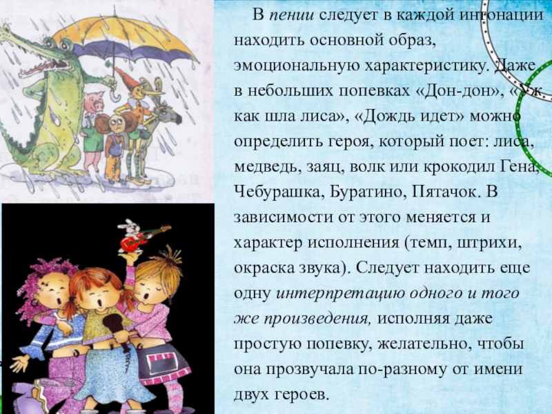 Даже в небольших попевках «Дон-дон», «Уж как шла лиса», «Дождь идет» можно определить героя, который поет: лиса, медведь, заяц, волк или крокодил Гена, Чебурашка, Буратино, Пятачок. В зависимости от этого меняется и характер исполнения (темп, штрихи, окраска звука). Следует находить еще одну интерпретацию одного и того же произведения, исполняя даже простую попевку, желательно, чтобы она прозвучала по-разному от имени двух героев.