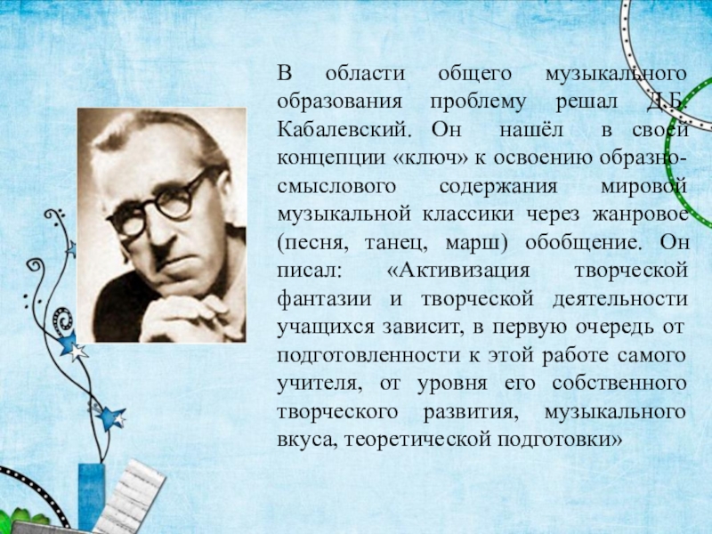 Слайд 9В области общего музыкального образования проблему решал Д.Б. Кабалевский. Он нашёл