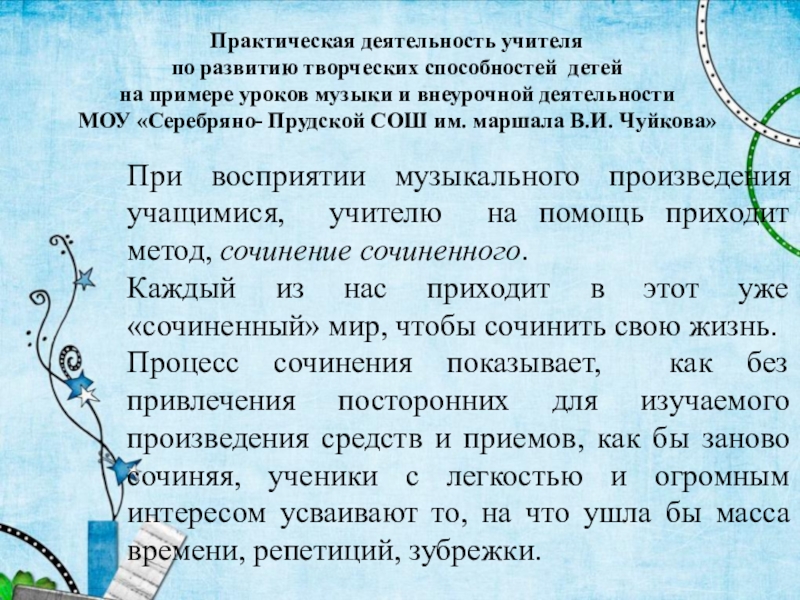 Практическая деятельность учителя по развитию творческих способностей детей на примере уроков музыки и внеурочной деятельности МОУ «Серебряно- Прудской СОШ им. маршала В.И. Чуйкова»