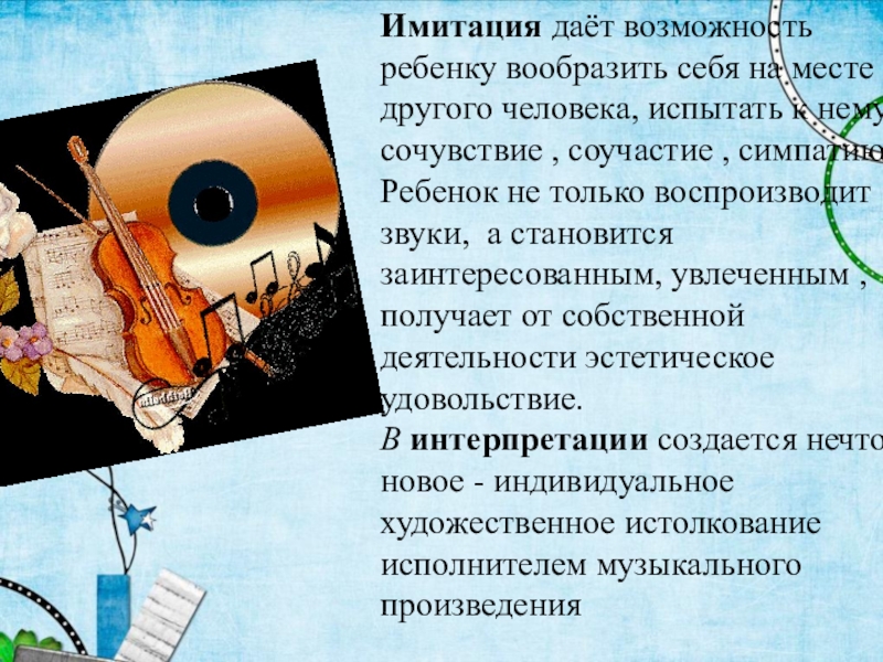 Слайд 12Имитация даёт возможность ребенку вообразить себя на месте другого человека, испытать