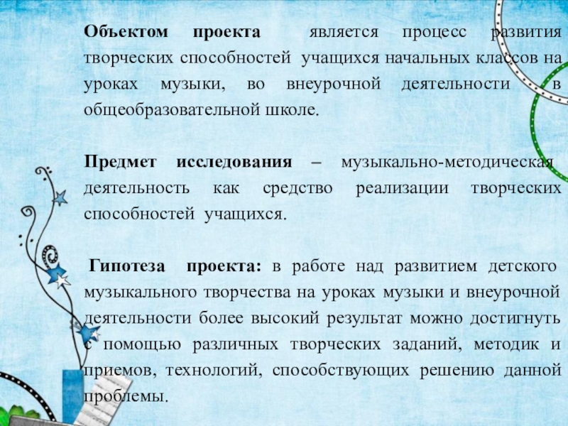 Слайд 6Объектом проекта является процесс развития творческих способностей учащихся начальных классов на