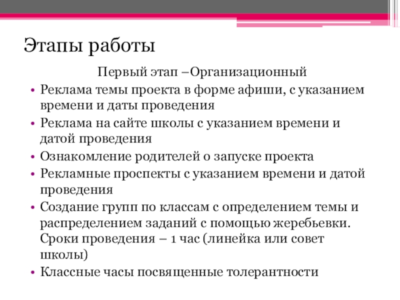Создание групп по классам с определением темы и распределением заданий с помощью жеребьевки. Сроки проведения – 1 час (линейка или совет школы)