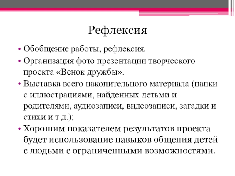Хорошим показателем результатов проекта будет использование навыков общения детей с людьми с ограниченными возможностями.