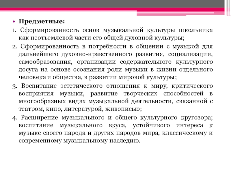 4. Расширение музыкального и общего культурного кругозора; воспитание музыкального вкуса, устойчивого интереса к музыке своего народа и других народов мира, классическому и современному музыкальному наследию.