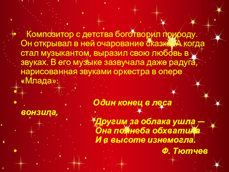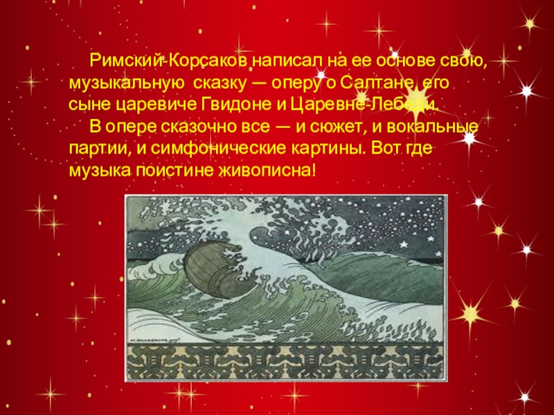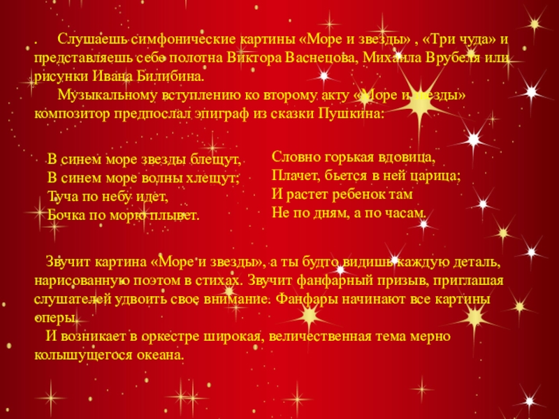 Звучит картина «Море и звезды», а ты будто видишь каждую деталь, нарисованную поэтом в стихах. Звучит фанфарный призыв, приглашая слушателей удвоить свое внимание. Фанфары начинают все картины оперы.