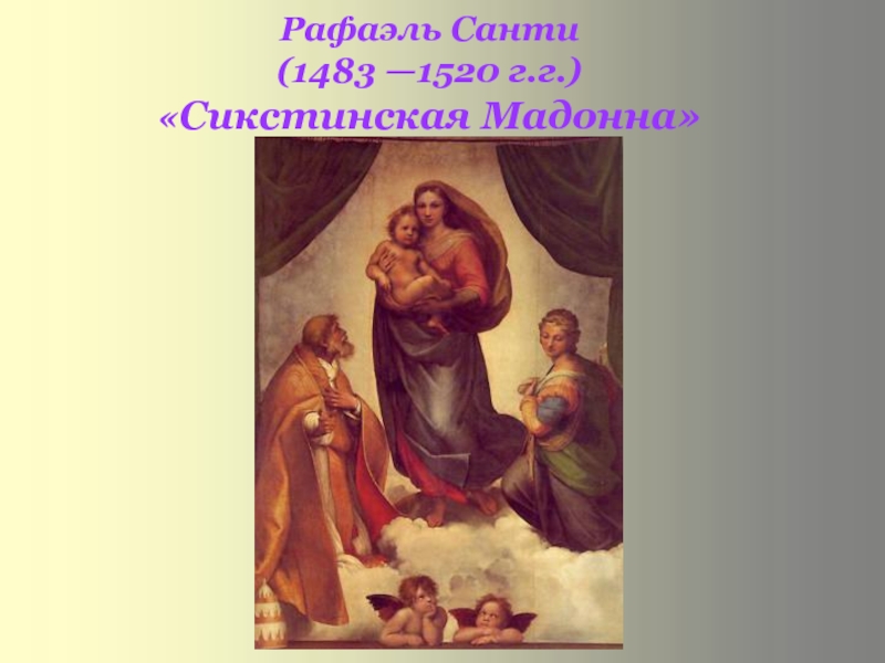 Слайд 18Рафаэль Санти (1483 —1520 г.г.) «Сикстинская Мадонна»