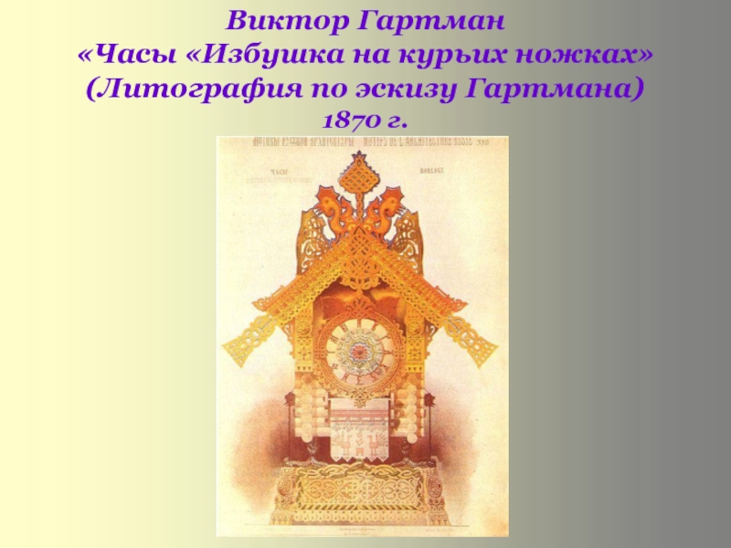 Слайд 4Виктор Гартман «Часы «Избушка на курьих ножках» (Литография по эскизу Гартмана) 1870