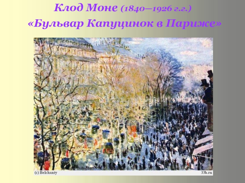 Слайд 16Клод Моне (1840—1926 г.г.) «Бульвар Капуцинок в Париже»