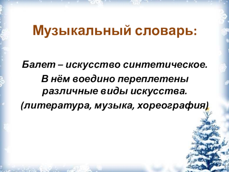 Музыкальный словарь:Балет – искусство синтетическое. В нём воедино переплетены различные виды искусства. (литература, музыка, хореография)
