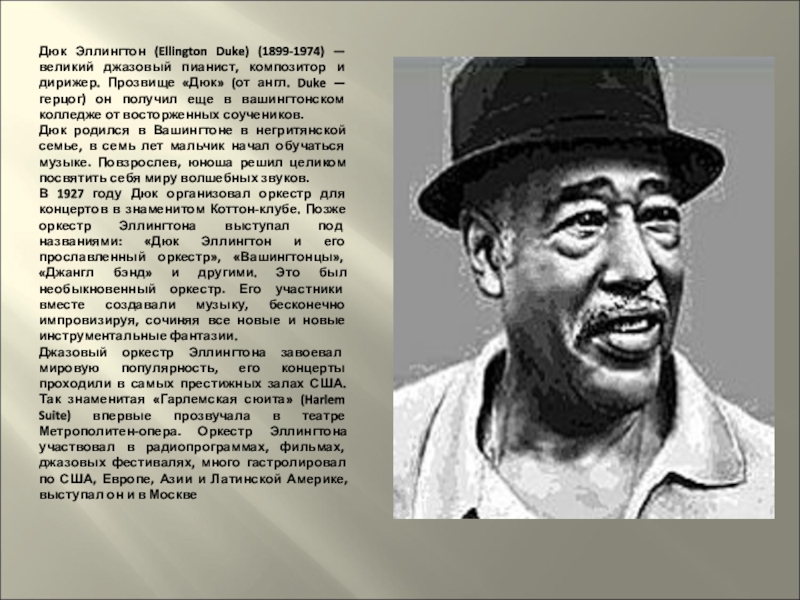 Слайд 6Дюк Эллингтон (Ellington Duke) (1899-1974) — великий джазовый пианист, композитор и