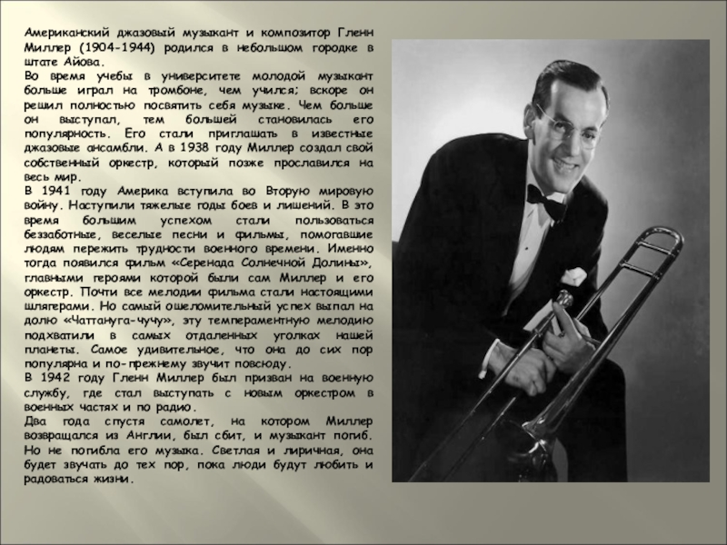Слайд 9Американский джазовый музыкант и композитор Гленн Миллер (1904-1944) родился в небольшом