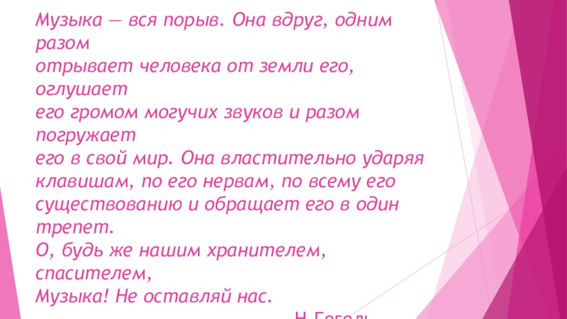 Слайд 2Музыка — вся порыв. Она вдруг, одним разом отрывает человека от земли его, оглушает его