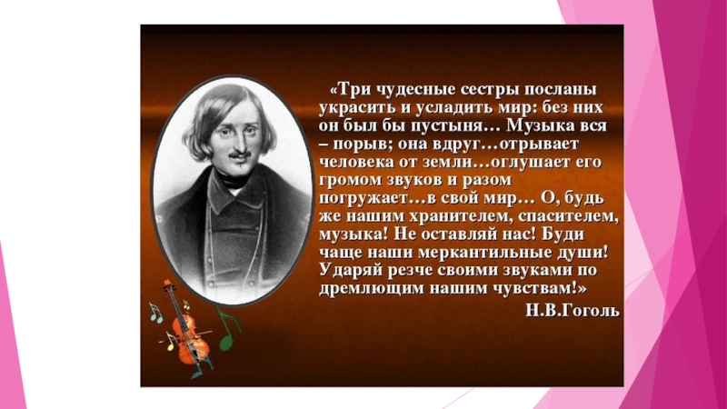 громом могучих звуков и разом погружает его в свой мир. Она властительно ударяя клавишам, по его нервам, по всему его существованию и обращает его в один трепет. О, будь же нашим хранителем, спасителем, Музыка! Не оставляй нас. Н.Гоголь