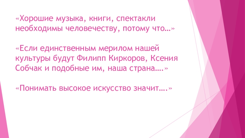 Слайд 7«Хорошие музыка, книги, спектакли необходимы человечеству, потому что…» «Если единственным мерилом нашей